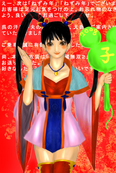 と、途中で飽きたよ すがぬまーず(こら) 昨日月一のアレが襲来し、ちょっと貧血気味です。。 いい加減軽くなってくれないかしら…。 今年賀状の作成にいそしんでます。 年末じゃあ絶対書かないので。(マジで) ブログにあげるのはどのキャラ入れようかなぁ。 戦国と三国からバランスよく抜きますかね。 それかピンでゴージャスに。。。うーん。。。 今日煙草買いに行くついでにセブンイレブンで肉まん(憎まんと出た 笑)とデミグラチーズまんを購入してみました。 肉まん久々で美味でございました! 無双にはまり始めた頃、肉まん3つ4つ連続で食べ「ライフ150回復!!」とかおバカをやってたりしました。(一人で) デミグラチーズまんですが。。何となくおいしそうなので買ったわけですが、個人的にはピザまんのが好き(ぇ) でもやはり王道は肉まんですよね。おいしい。 何かアレな話で申し訳ないんですが、只今ブラジャーネットが行方不明。 な、何でなくなるんだ?!実は2個目だったりするんですよねぇ…。 アレがなきゃ洗濯機に放り込めないじゃないのよ! 手洗い面倒なのよ! で、出てきておくれ…。