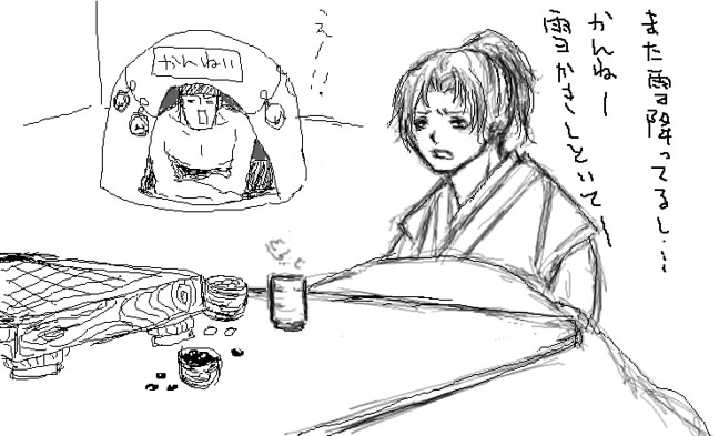 …って、もうこんな時間だぁあああああ! 眠いわけだよね。 実はメガネかけて作業してると眠くならないんですよ。 で、メガネはずすと凄い睡魔。くっそう…。 これだからパソコンってこわい。 最近絵を全然アップしてないので、ノートにSAI入れて描きました。 しかも14日に間に合ってないってね!うふふ! もちろん妄想inしてます。 設定→チョコを作ったはいいが、本人を目の前に恥ずかしくて渡せないでいると、バルが自分からかっさらう。(kimoiyoooo) 本当は凌統の裸エプro(ry チョコをね。作っているところを描いてたんですけど、途中絵がキモくなったので中止。 さて、14日にわたくしに甥ができました。 おばさんですよ、おばさん。 …ありえん orz 絶対におばさんなんて呼ばせませんがww 姉が出産のために少し前から帰ってきてたんですよ。 生まれる前よりも忙しくなりそうです。。うぅ…。