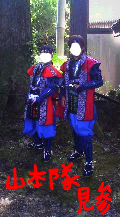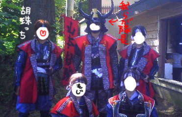 私も「載せちゃうか」的なノリで載せちゃいます。(ぇ) 許可を頂いてないので顔は潰しますが、せっかく送っていただいたんですしね! さぁ、ご覧アレ! 写真 左 もじと胡珠っちのツーショットでげす! 決まってるでしょ?(笑)抜刀もしたかったけど、人が多かったですしねー。残念。 って、私チビですね。すんません。 胡珠っちは背が高く、とっても様になっててカッコイイんですよーv 写真 右 でました!山本ハーレム!(違) 隊長を胴前女武者が包囲。 隊長!一生ついていきますぞぉ! さて、↑これは行列開始前のことですね。 本日は合戦のことをちょこっと。 合戦場に音楽と共に入場。心なしか武田軍の方がかっこよかったのは気のせい? 現在放送中の風林火山のテーマ曲で、もう、歩きながら鳥肌ものでした。 入場が終わり、何だか変な間が…。 と、ライトが消灯!突然会場は真っ暗です。 おおぉぉ!音楽が流れ始めると白馬に跨った謙信公(ガクトさん)が駆けて参ります! ん~…かっこいい。 そして場を一周二周くらい駆け、観客の近くで「時を越えて~」というセリフ!(覚えてなくてすんません) セリフの後、ガクトさんは退場されてしまいましたが、本来行列だけの参加だったのに。。と心が熱くなりますね。 きっと戦も何処かで見守ってくれていたのでしょう! えぇと、合戦の内容ですが。。 疲労とボリュームにより、よく覚えておりません(殴) 山本隊が突撃する手前、上杉忍VS武田忍があったのですが、これが物凄い迫力でした! なんてったって演ずるのは(おそらく)プロの殺陣役者さん。 燃える忍者刀で戦う様子はヨダレものですよ。カッコヨカッタ。 合戦終了、そして慌しい時間の始まりです(ぇ) 25日に帰宅予定だったので体育館まで競歩ですよ。(死ぬほど疲れてますが終電を逃したりしたらシャレにならないので) 体育館では武将の方たち、各隊の方たちが撮影会をおっぱじめておりました。 い、いいなぁ!しかし、我々にはそんな時間すら残されていない! 21:30頃体育館に到着し、電車の時間は22:11。 移動に普通の速度で歩いて駅まで20~30分。まだ鎧を着込んだまま。。。 大ピンチ!!! ものすごいスピードで着替えをし、お世話になった方々への挨拶もままならず体育館を後にしました。 移動も荷物を抱えまたしても競歩! おかげで電車にも間に合い、無事帰宅することができました。(胡珠っちのご両親、ありがとう!!!) ほんっとうに疲れましたが、ほんっとうに楽しい行事でありました。 地元の方たちのあたたかさ、親切心に心から感謝しております。 山本隊・柿崎隊の皆様、着付けをご指導くださった方、その他お世話になった方々、本当に!本当にありがとうございました! 当日言えなかった分を込めて、ここでお礼いたします。 できればもっと体力をつけてまた参加したいなぁとも思ったり。 そのときは宜しくお願い致します!