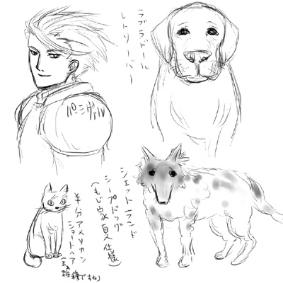 パーシヴァル君ともじ家の動物たち。 パーシヴァルの鎧とかは思い出せないので触れないでください。 現在我が家には犬2匹と猫1匹が同居しております。 全員屋内飼いなので夏は臭います(え。 ラブは顔がすごく人っぽいというか。。おっさんくさいというか。。 何ともいえない愛嬌があっていいですよね。黒は凛々しい顔してるのに。 イラストにもあるように、シェルティーが大変なことになってます。 そう、毛を刈られた羊のよう。。。 ついこの前、父と母が哀れな子羊の毛をばっさばっさとちょん切ってしまったのです。 その場は爆笑で済ましましたが、ふと考えると散歩当番の私、すごくピンチじゃなかろうか。 だって、すごく恥ずかしいよ!(笑) いやぁ、本当に異様な犬にしか見えないんですよねぇ…。ププ…。 早く涼しくなるといいですよね。犬のためにも。私のためにも。(ん? 特に冬は猫が格段に可愛くなりますからね。 毛が…!ふっかふかで!!v 猫溺愛家なのでたまらんとです。異常者に変身しますよね?ね?(同意をもとめんな) 無双髪結いお題11より